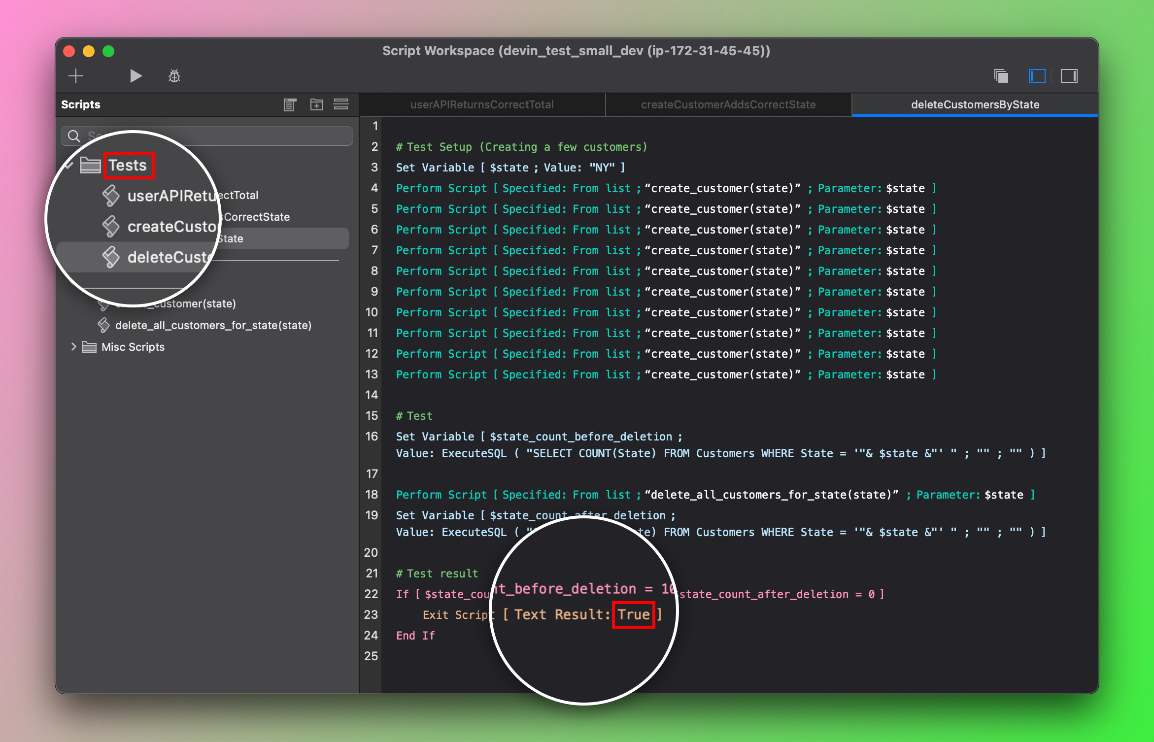 Devin introduces a simple testing framework that seamlessly integrates with your FileMaker Script Workspace, allowing you to write **Test Scripts**.