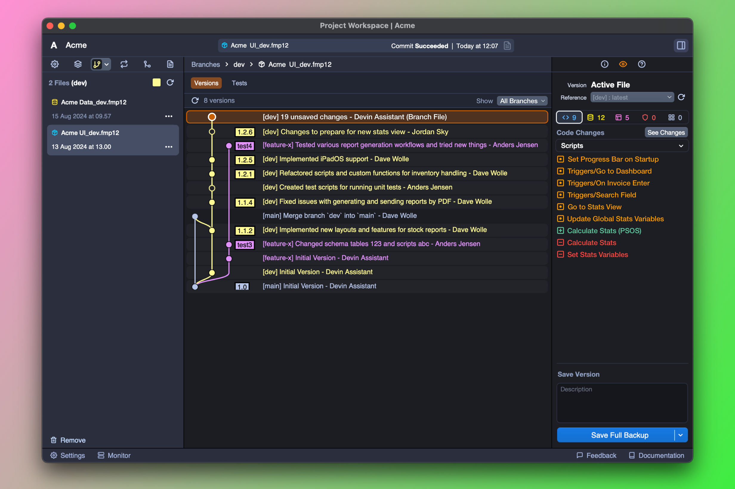 <figure><img src="https://content.gitbook.com/content/yVoWYDKPRZW9z9KzLOvL/blobs/4Yt9doYqTdRTySFDRwx7/1.2-ui.jpg" alt=""><figcaption><p>プロジェクトワークスペース: fmp12ファイルのブランチ、バージョン、変更の概要</p></figcaption></figure>