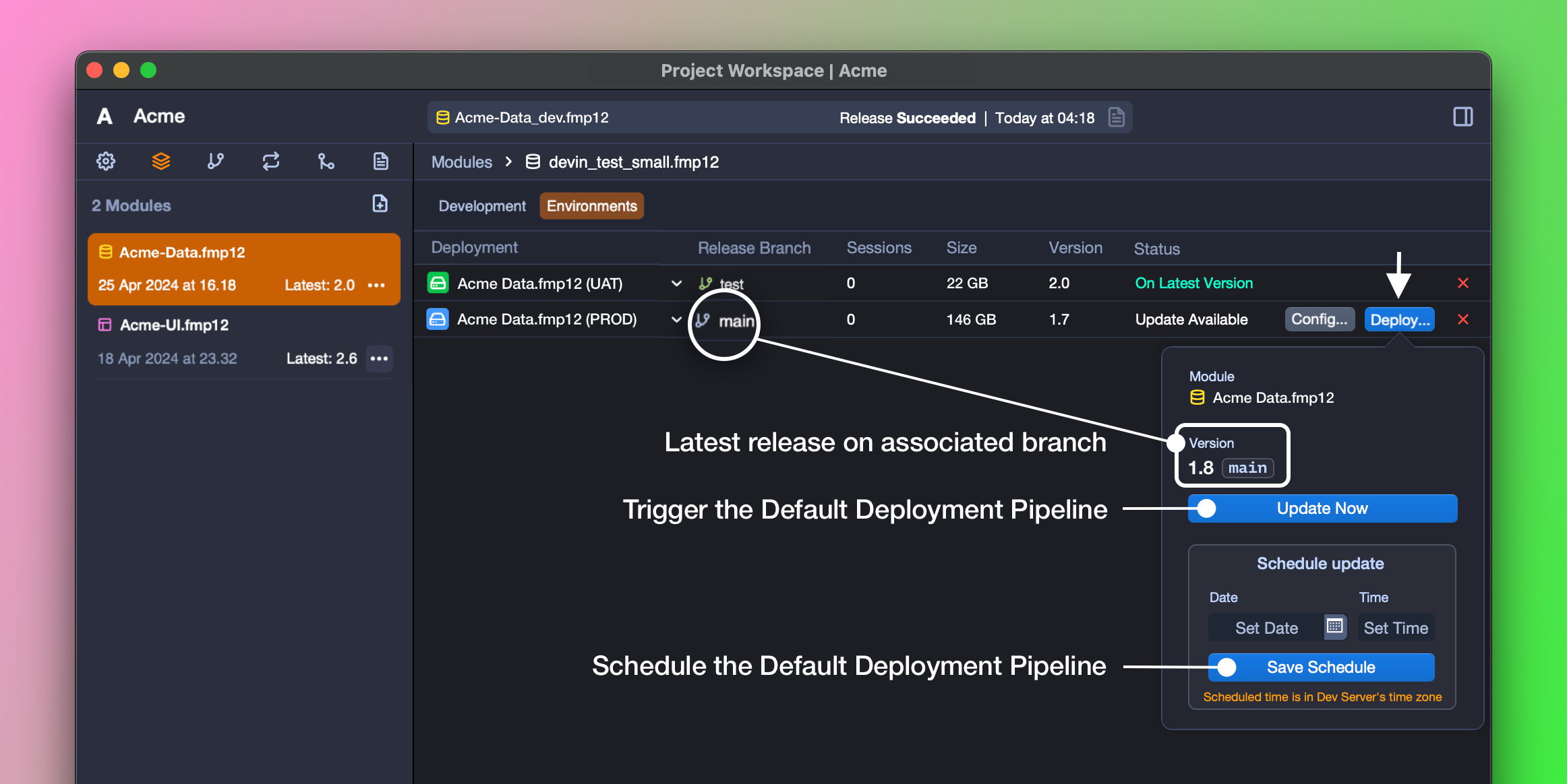 4. Use the Deploy or Roll Back popover to trigger the Default Deployment Pipeline now, or schedule it for later.
