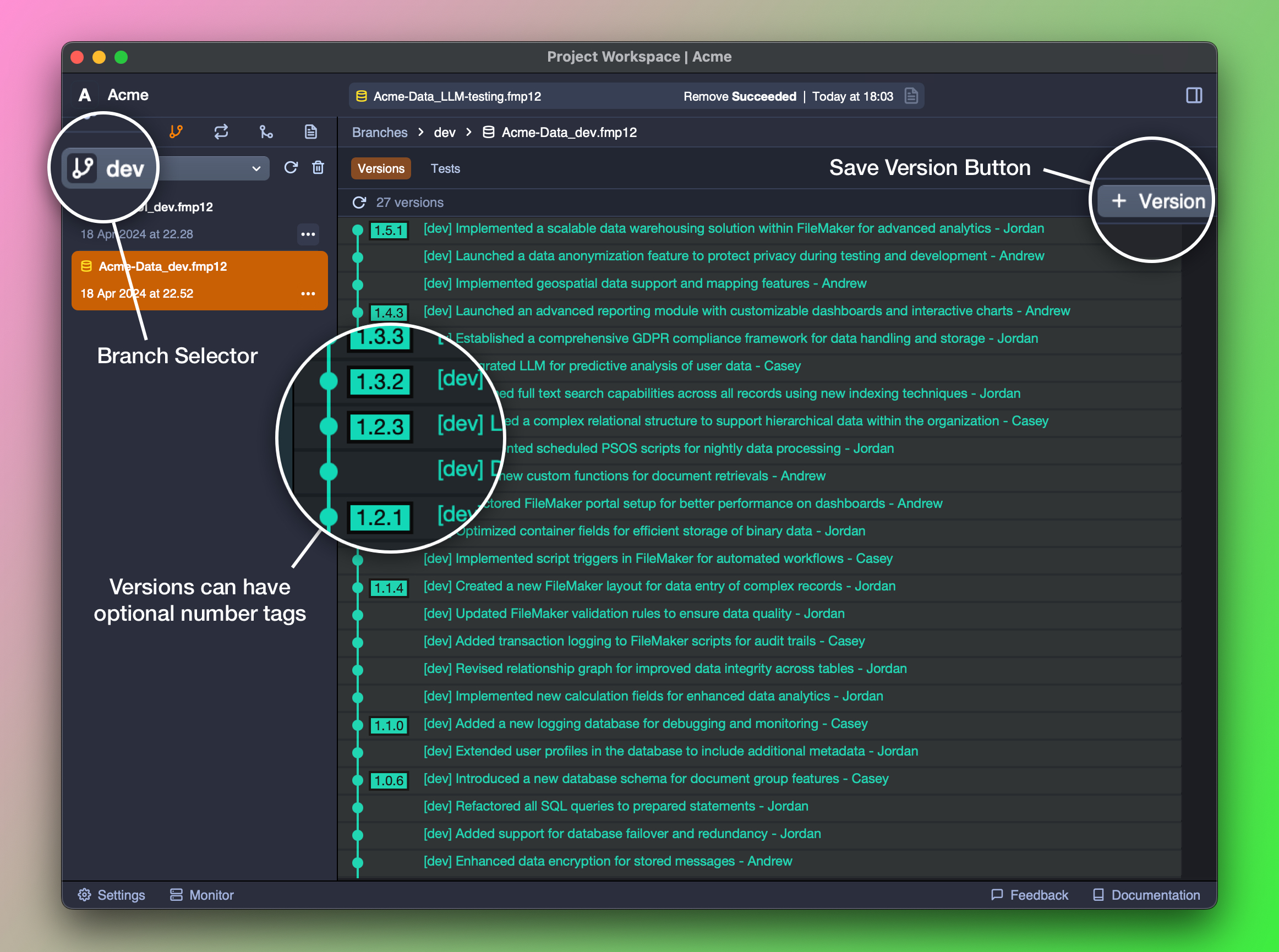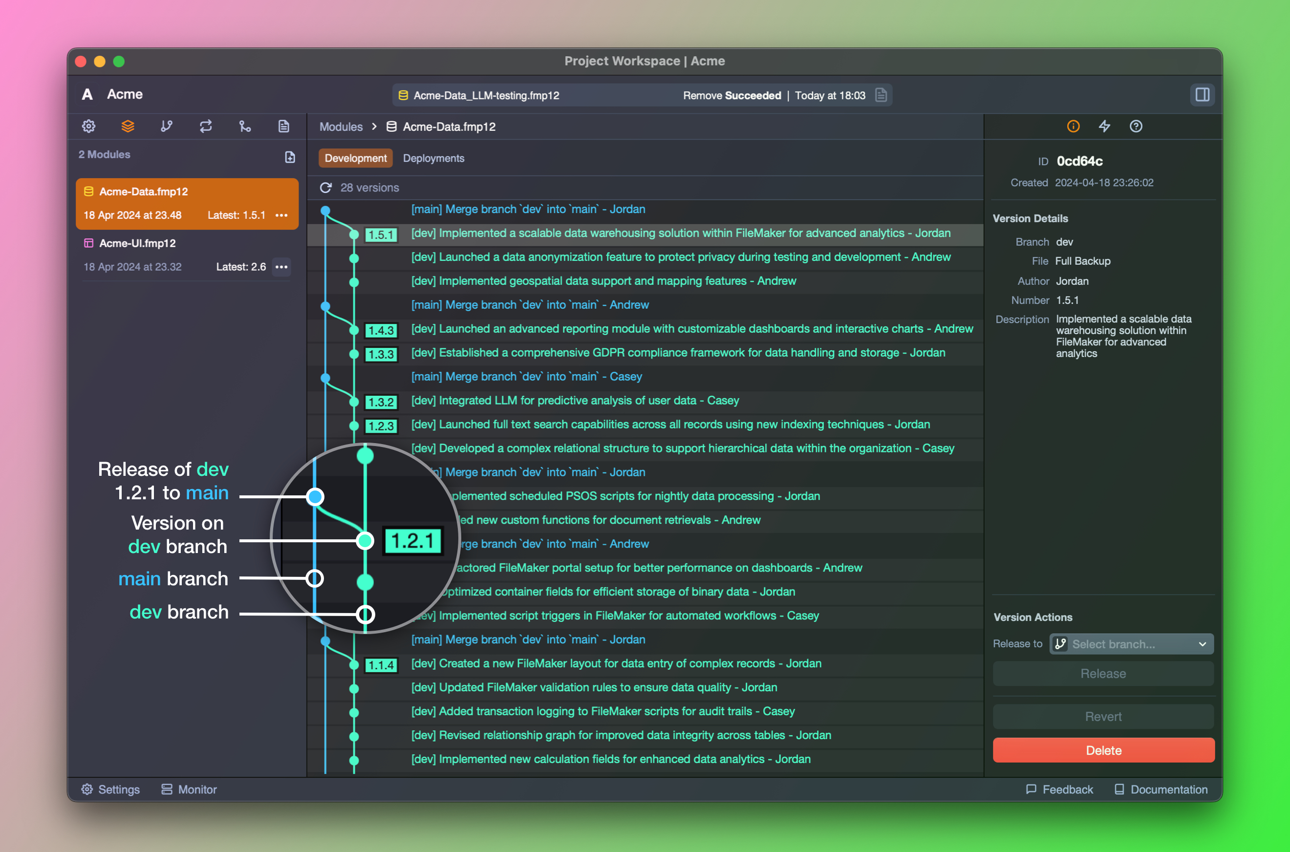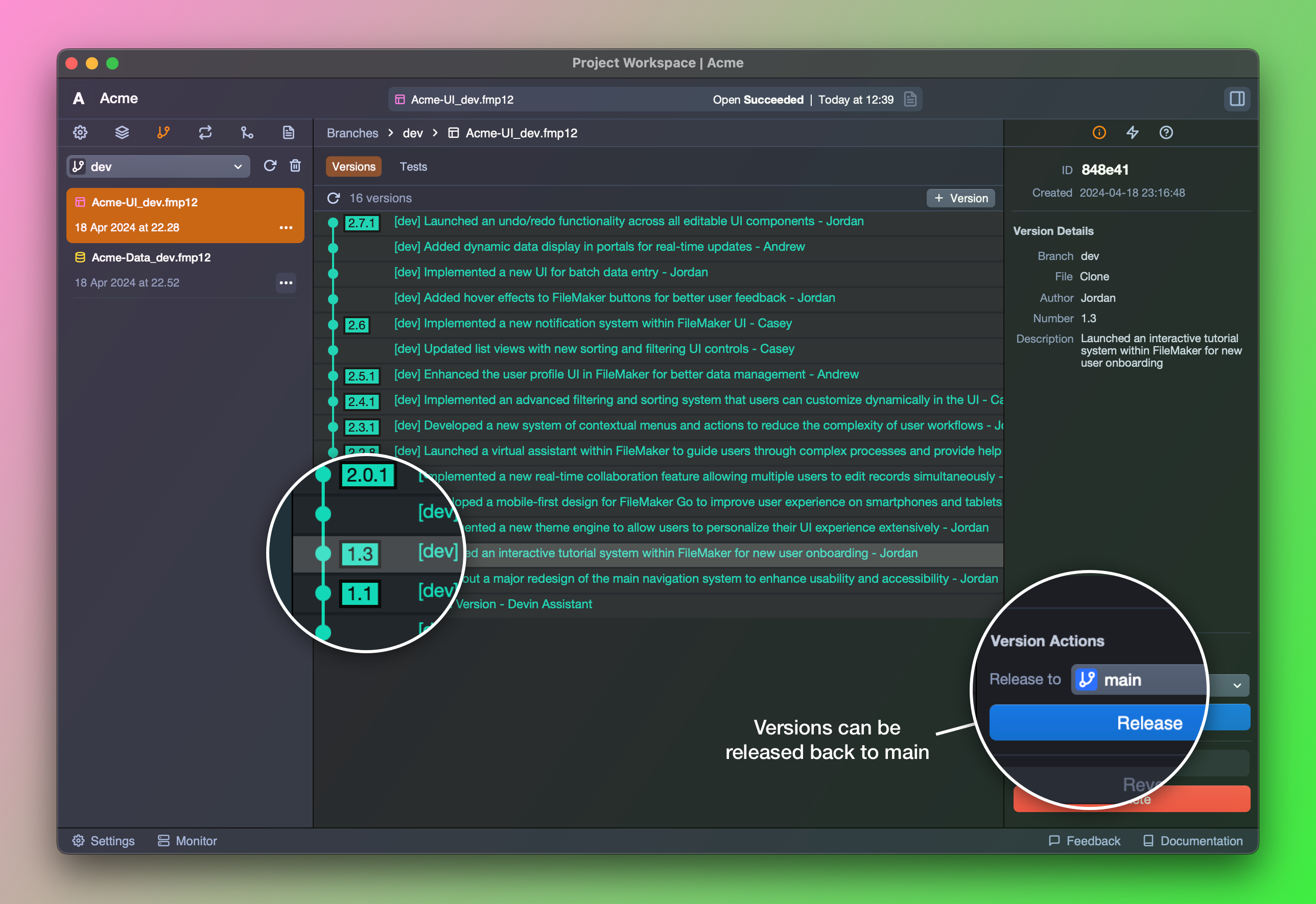 Claris FileMakerにおけるバージョン管理の従来の課題を理解した上で、Devinはバージョンやブランチの管理をシンプルかつ直感的に行えるシステムを導入しています。