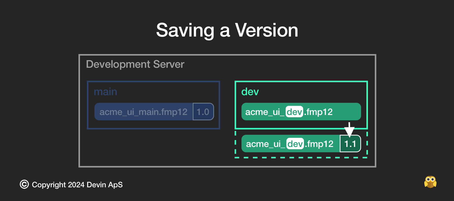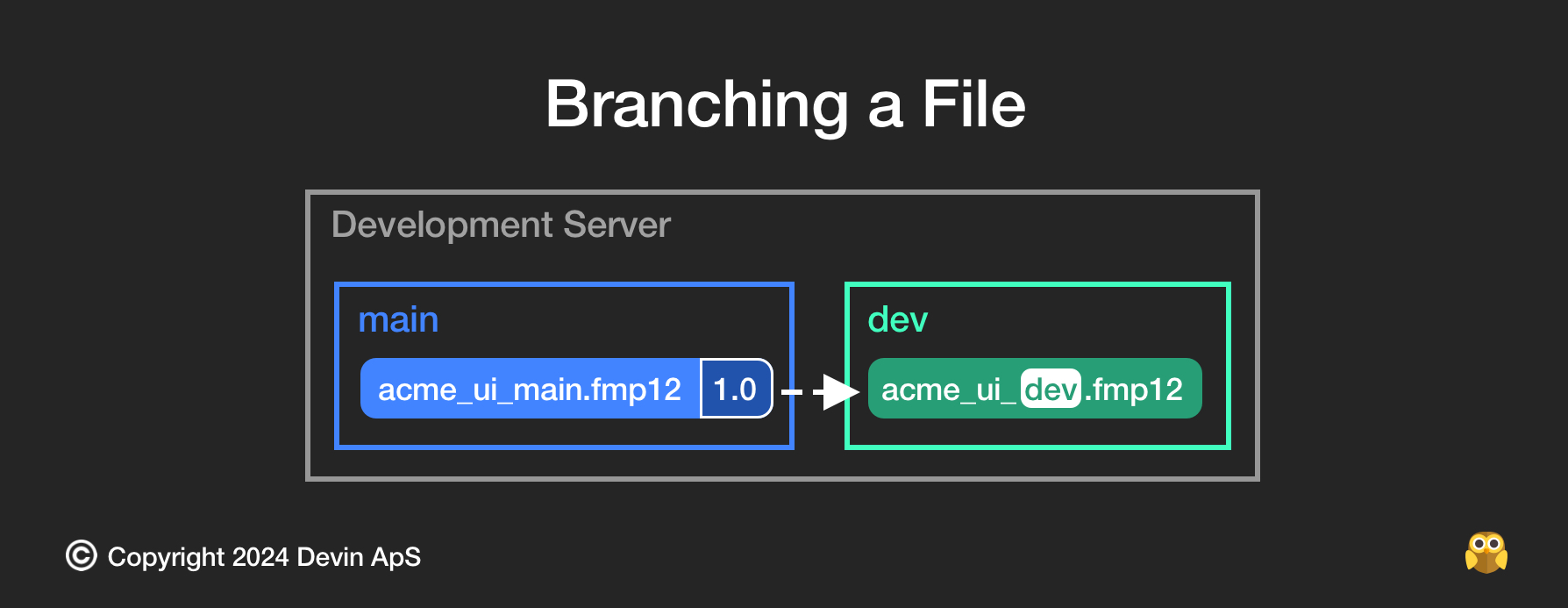 Devinにおけるブランチは、開発ファイルの分離されたコピーとして機能し、<ファイル名>_<ブランチ>.fmp12という形式で名前が付けられます。各プロジェクトにはデフォルトのブランチがあり、これを「main」と呼びます。基本的な考え方としては、メインファイルに直接変更を加えるのではなく、異なる目的に応じて新しいブランチを作成します。たとえば、開発用のブランチは「dev」と呼ぶことができます。