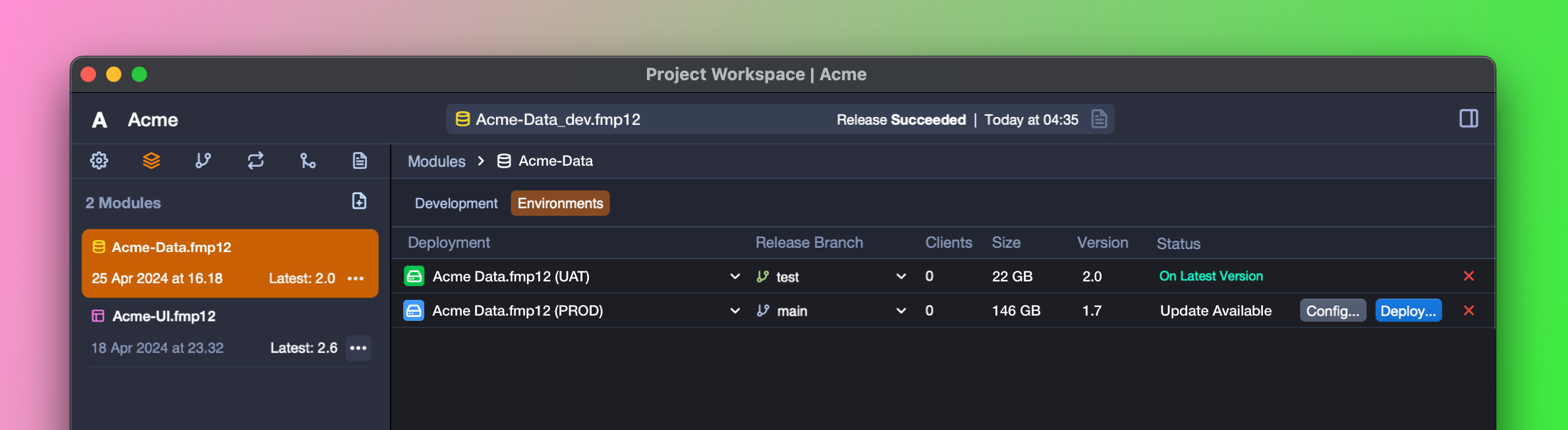 Devinでは、開発サーバーの外に存在するすべてのfmp12ファイルはデプロイメントと見なされます。これらのデプロイメントは、開発ライフサイクルの異なるステージ(環境)に位置するプロジェクトのライブバージョンです。それぞれのデプロイメントは、開発環境内の対応するファイルおよびリリースブランチにリンクされています。このようにして、特定の環境にブランチをリンクすることで、カスタムデプロイメントフローを設定することができます。